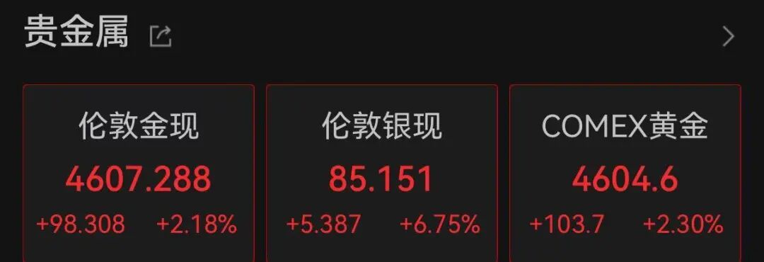 由于地缘政治紧张,黄金、白银持续拉涨,截至发稿,现货黄金涨超2%,冲上4600美元,白银一度冲上86美元,截至发稿涨超6%。