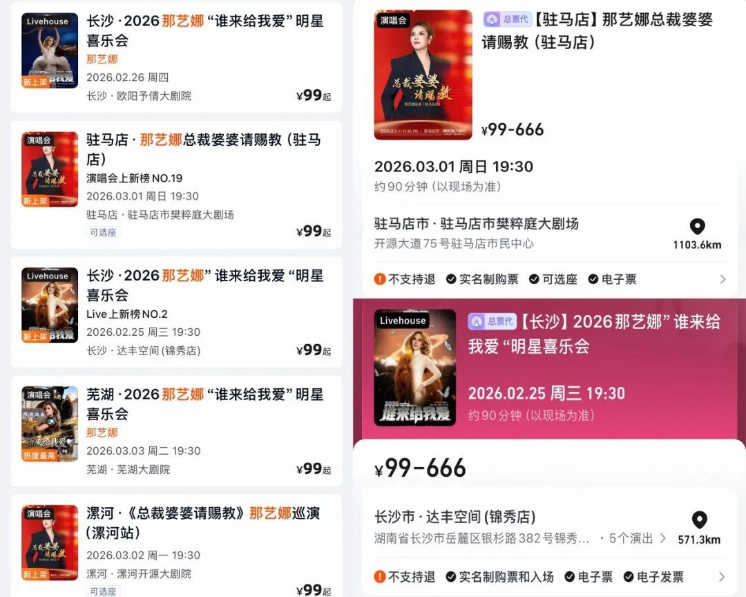 2月21日下午,一位在互联网售票平台购买2026那艺娜“谁来给我爱”明星喜乐会门票的消费者向记者介绍,撤销演出许可事件在网络上发酵后,他找到互联网售票平台要求退票,平台工作人员则回应称不支持退票。记者检索网络购票平台发现,那艺娜多场演唱会门票仍处于在售状态,且在售票页注明门票“不可退”。
